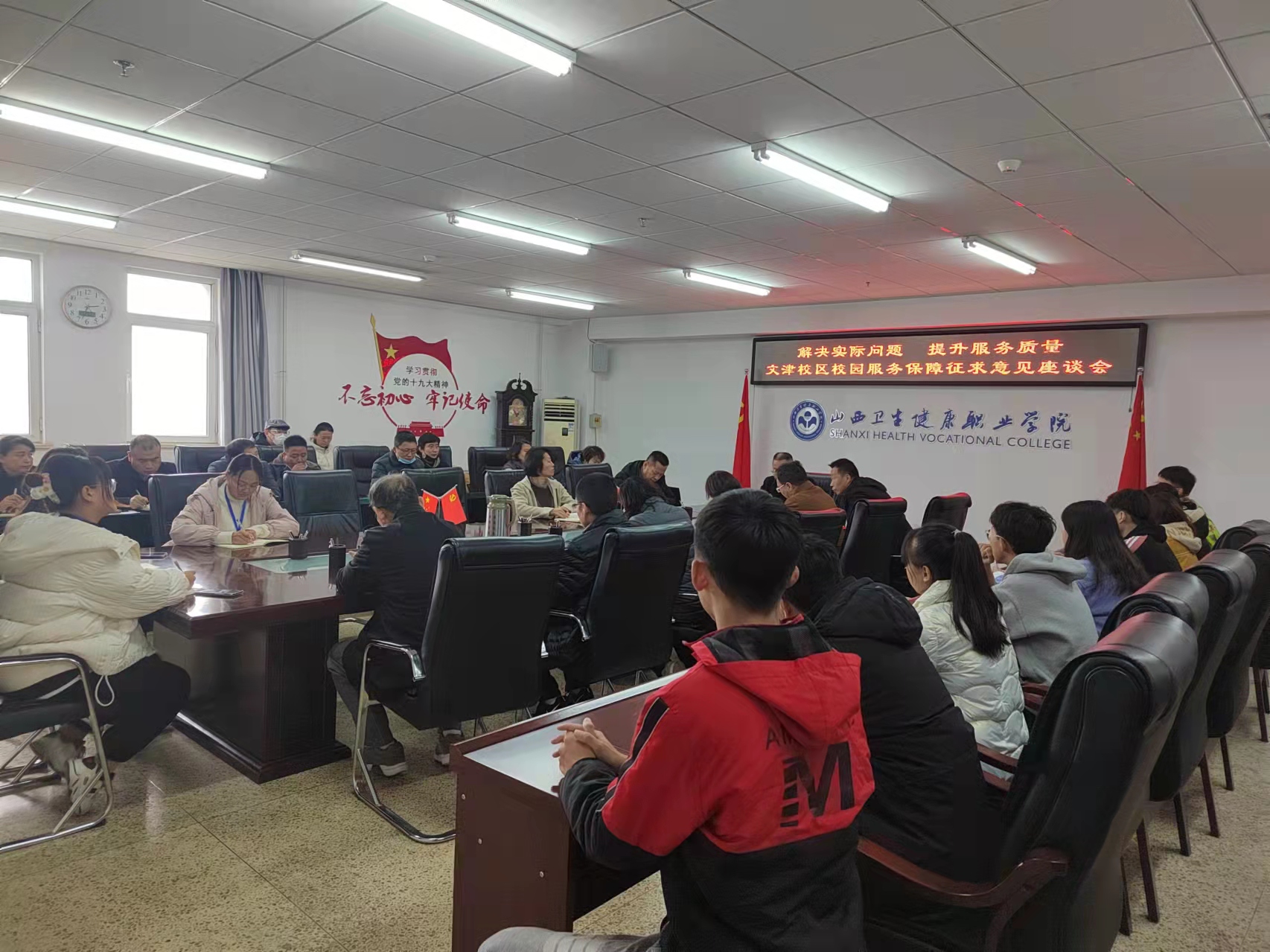 为贯彻落实党史学习教育“我为群众办实事”实践活动,切实提高学院后勤服务保障能力和水平,11月29日下午,文津校区校园服务保障工作座谈会在厚德楼十层会议室召开。会议共邀请了各二级学院、系(部)学生代表20人,教职工代表7人以及驻校服务企业代表10人。学院分管副院长梁三平出席会议,会议由安全与后勤管理处处长李虎义主持。