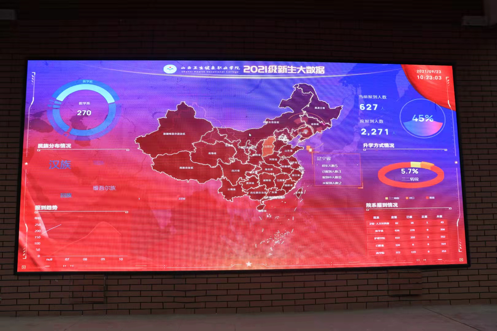 为进一步简化报到程序、缩短等候时间,智慧迎新系统上线,一键完成个人信息填报,生成专属二维码,新生扫码即可完成班级注册和缴费。大数据实时更新,显示报到人数及学生来源、民族等信息。据统计,截止9月24日16:00,已完成报到新生2236人。