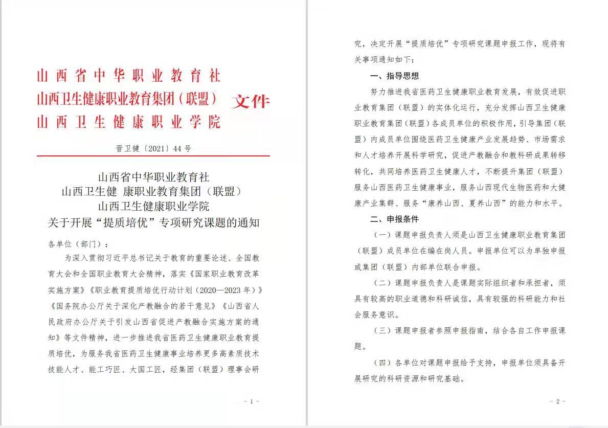 山西卫生健康职业教育集团(联盟)成立以来,不断探索校际之间联合办学新模式,努力实现人力资源、设备资源、资金资源、市场资源、技术资源和文化资源等方面的共建共享,促进职业院校、行业、企业和区域之间的资源共享、优势互补。今年联盟与学院聚焦国家职教发展重点工作,集思广益,在山西省中华职教社的支持下,共同启动“提质培优”专项研究课题工作。课题面向联盟117家单位开展申报,课题研究类型分落实立德树人根本任务、深化职业教育产教融合、校企合作、职业教育治理能力提升、职业教育“三教”改革、职业教育信息化建设、服务山西转型发展及推进对交流与合作等六大类,着力引导集团(联盟)内成员单位围绕医药卫生健康产业发展趋势、市场需求和人才培养开展科学研究,促进产教融合和教科研成果转移转化,共同培养医药卫生健康人才。