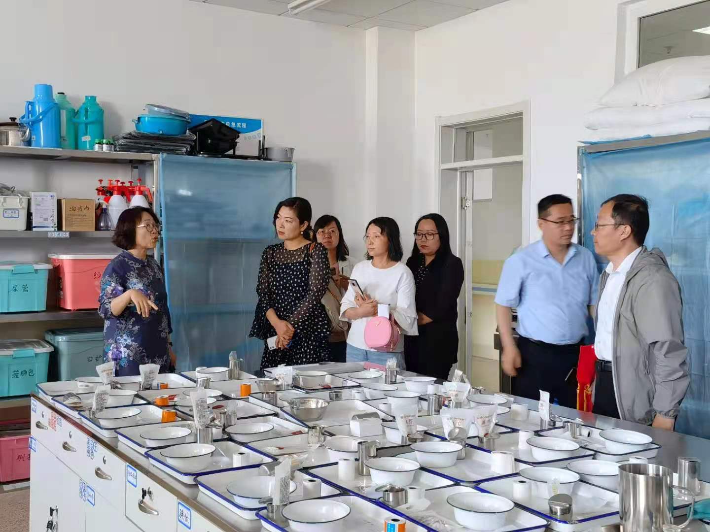围绕孝义职教中心在办学过程中存在的教材选用、师资力量配比、实训室建设、中职人才培养目标等现实问题进行了深入的探讨和交流,护理学院杨颖院长结合自身1+X老年照护证书开展情况给予了对方建设性的指导,并带领考察学习同志实地参观了我校的老年照护示教室、准备室、适老化卧室等实训场所。