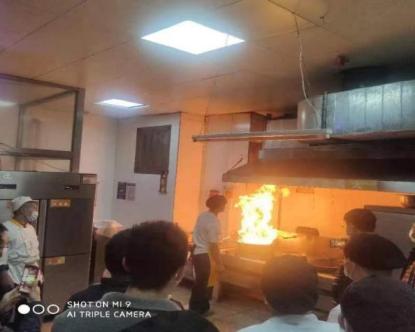 油锅起火之后,相应消防设备火灾报警器立即启动,电源强切,电梯自动停运于食堂一层。厨师快速关闭煤气阀,打开灭火毯并完全覆盖在起火油锅上,火势熄灭。听到紧急疏散哨声响起后,全体食堂工作人员在疏散组引导下,按照“分(2个)出口”“靠右行”的疏散流程,迅速有序撤离,一分钟之内全部演练人员安全到达安全疏散地点。整个过程紧凑高效、有条不紊、操作规范,有效地检验了全体后勤人员应对突发状况的能力,同时,为熟悉应急处置流程、查漏补缺提供了帮助。