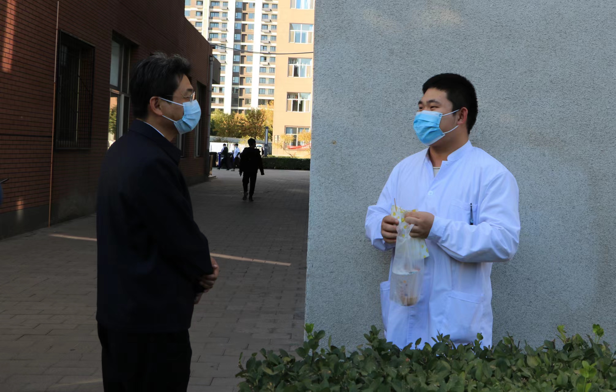 督导组一行分别对我院校门管控、隔离医学观察区使用、师生核酸检测组织、餐厅和商超供给及物价稳定等方面进行实地走访。在走访过程中,还随机与物业人员和学生进行亲切交谈,对学院在工作生活条件、饭菜质量和物价稳定等方面的保障情况进行了解。在得知我院班子成员带头自10月3日起就组织教职工和三方服务人员实行师生一体化防疫管理后,对师生员工的付出表示慰问,对学院党委的科学防控、精准部署表示肯定。