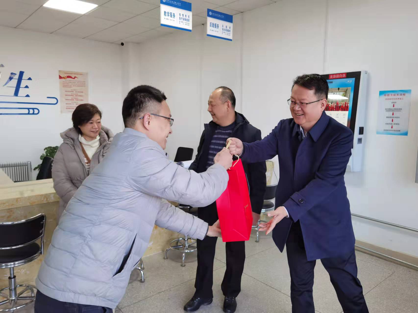 1月31日上午8:30,冀孝如来到师生服务中心,与值班人员一一握手、暖心交谈,将学院工会精心准备的“温暖牌”慰问品亲自交到每一个人手中,并代表学院党委对坚守在工作岗位上的全体教职工表示衷心的感谢。