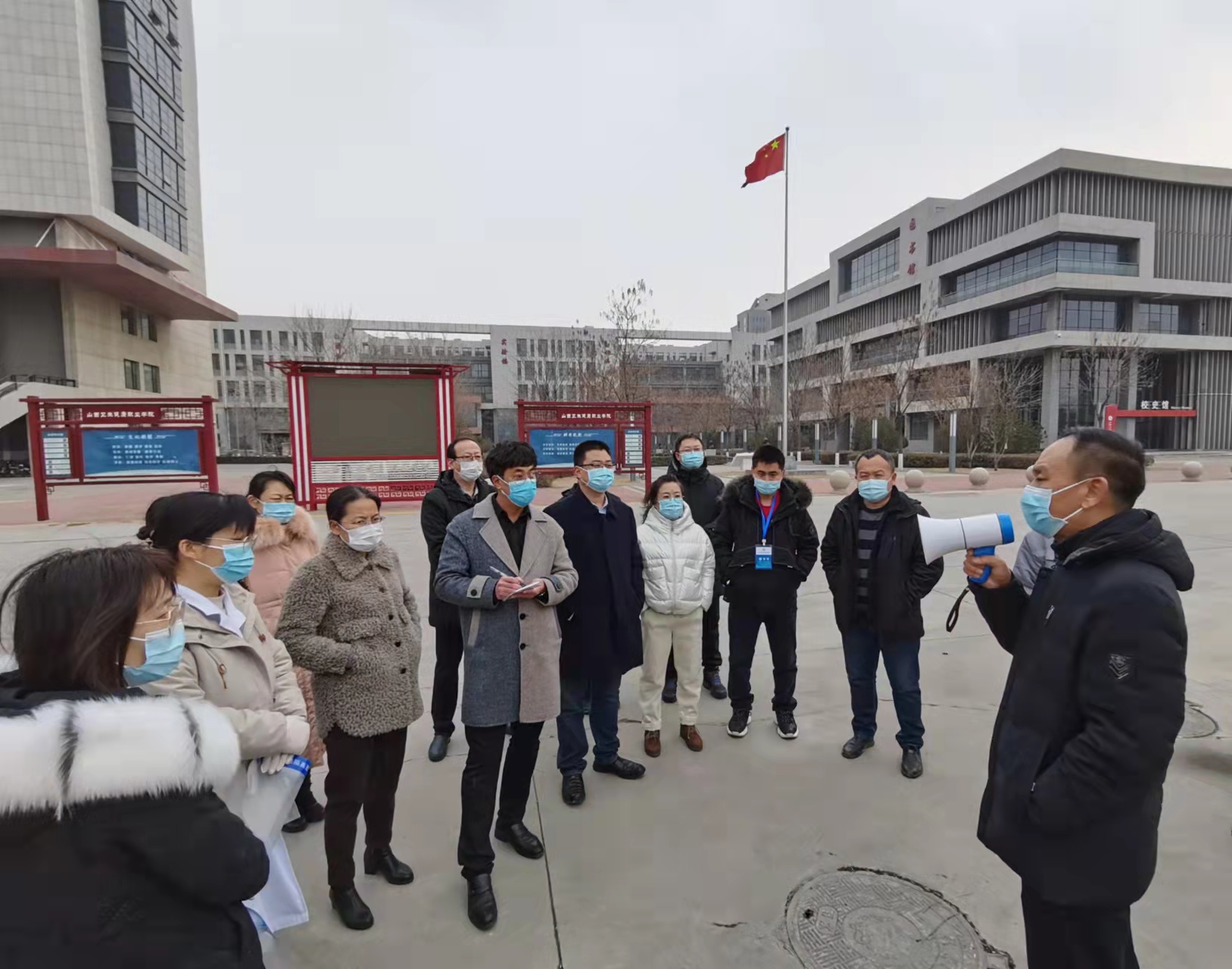 为科学规范做好新冠肺炎疫情防控工作,确保师生返校各项工作有序进行,2 月 18 日下午,我院在文津校区北门组织开展了学生返校疫情防控专项模拟演练。学院党委副书记赵建君在现场督导指挥,并宣布演练开始。各疫情防控工作组成员、部分留校学生代表、当日值班人员及康养校区代表参加演练。