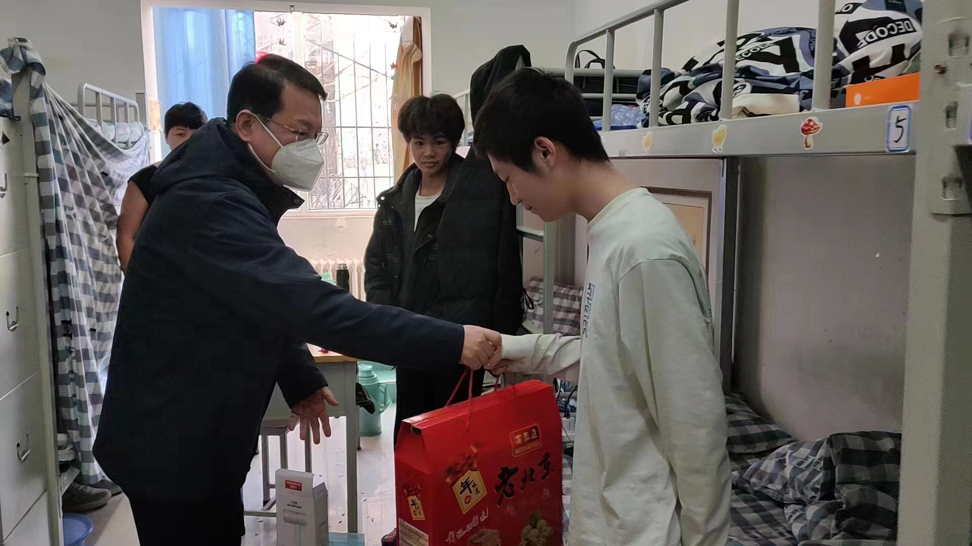 正值新春佳节之际,校门口迎风飘扬的红旗、张贴的对联将校园内外装点一新,处处洋溢着浓浓的年味、寓意着建校70周年的新希望。院领导先后来到门卫室、师生服务中心和学生宿舍,为值班人员、留校学生送去节日的问候和饱含深意的礼品。同时,还与师生进行亲切交谈,了解校园运行情况和大家工作、学习、生活的安排,向他们及家人送上节日的问候,并鼓励大家做好假期校园值班值守工作,维护校园安全稳定和正常运转。