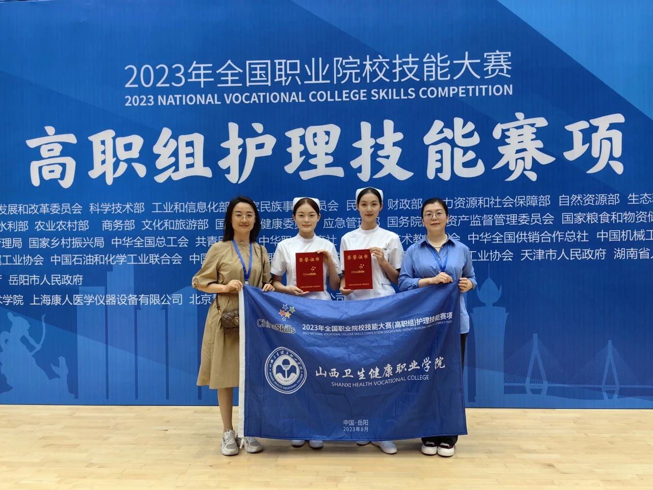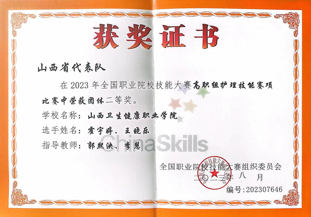 8月25日—28日,2023年全国职业院校技能大赛高职组护理技能赛项在岳阳职业技术学院举办,由郭熙泱和李慧两位老师指导的2020级护理专业学生霍宇婷、王晓乐代表学院参赛,荣获团体二等奖。