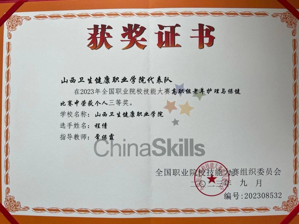 9月22日——25日,2023年全国职业院校技能大赛(高职组)老年护理与保健赛项在沧州医学高等专科学校举办,由常保霞、常丽霞老师指导的2020级健康管理专业学生程倩代表学院参赛,荣获三等奖。这是我院首次参加该项国赛,向取得成绩的老师和同学表示祝贺!