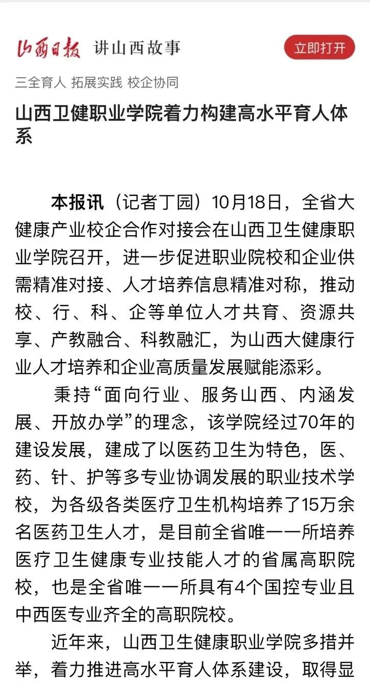 近日,山西日报、学习强国山西学习平台刊发文章《山西卫健职业学院着力构建高水平育人体系》对我院育人体系建设进行详细报道。