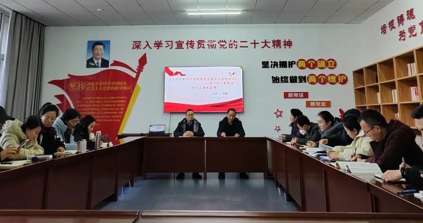 会议首先进行的是以“习近平新时代中国特色社会主义思想概论——全过程人民民主”为主题的集体备课活动,主讲教师郭鹏就“什么是全过程人民民主”、“全过程人民民主的优势”以及“怎样坚持和发展全过程人民民主”三个问题与大家进行学术交流与分享。接着思政部主任董民丽对照《普通高等学校马克思主义学院建设标准(2023年版)》,立足我院思政部建设发展的基础与现状,围绕组织领导与管理、思政课教学、教师队伍、马克思主义理论学科建设、社会服务与社会影响、党的建设与思想政治工作等五个方面进行汇报,查摆存在的差距与不足,并针对性提出整改意见。