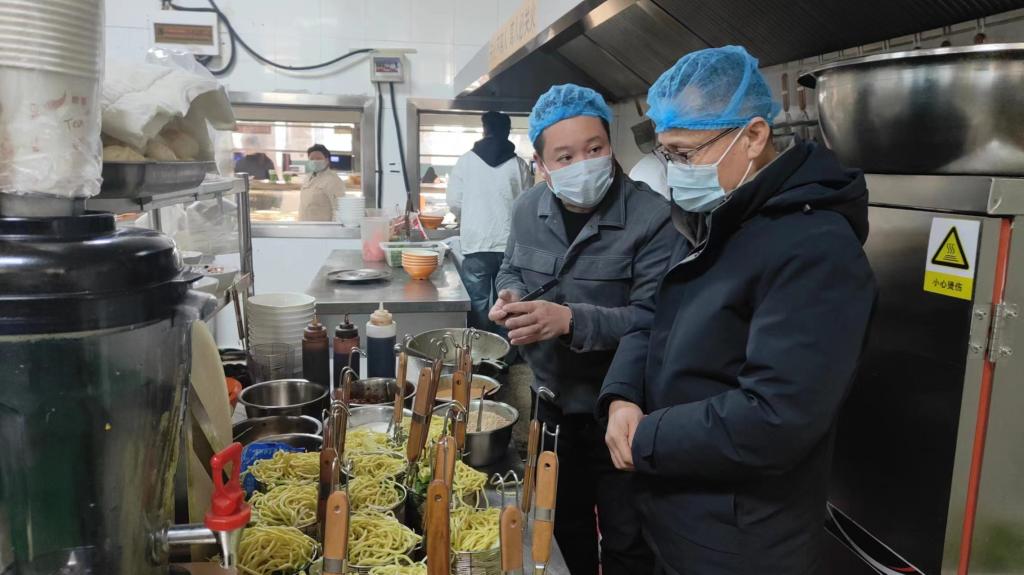 王轩实地查看了食堂环境卫生、饭菜花色品种、仓储物资管理,详细询问了日常台账管理、物资采购、食材加工、食品留样、餐具厨具清洗消毒、用火用气用电安全等环节,详细了解日常食品卫生安全监管举措,并对检查中发现的食堂烟道排烟不畅的问题提出限时整改要求。
