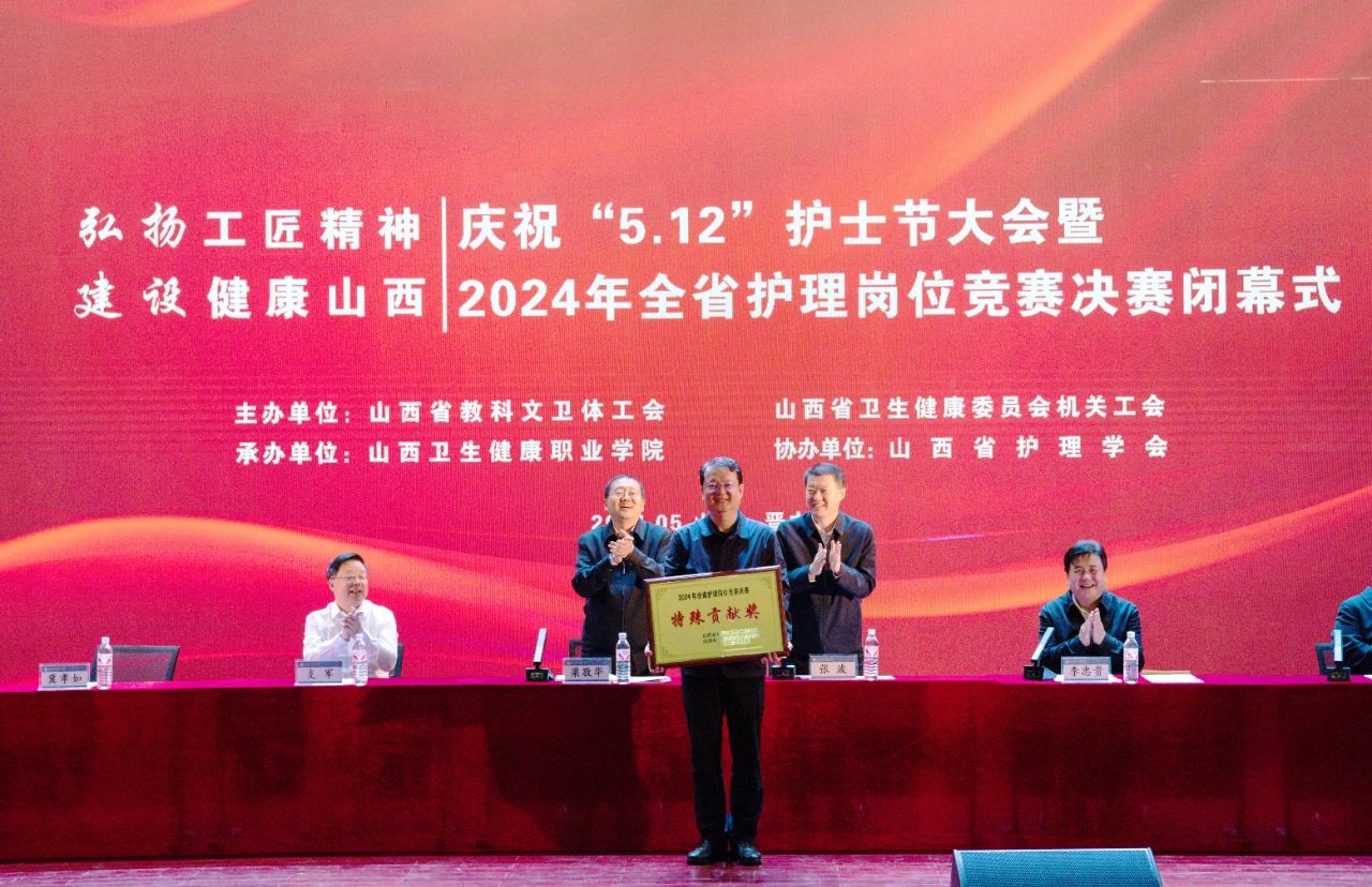 5月9日,2024年山西省护理岗位竞赛决赛在我院成功举办。我院作为本次大赛的唯一承办单位,学院领导高点谋划、高位推动,全院各部门通力配合、高效落实,举全院之力,紧盯节点、突出重点,圆满地完成了大赛组委会安排的各项任务,得到了省总工会和省卫健委的高度肯定。闭幕式上,山西省卫生健康委党组书记、主任张波对我院的护理专业人才培养提出殷切期望并向全院护理专业师生致以节日问候。山西省总工会党组书记、常务副主席梁敬华亲自为我院颁发了“特殊贡献奖”。