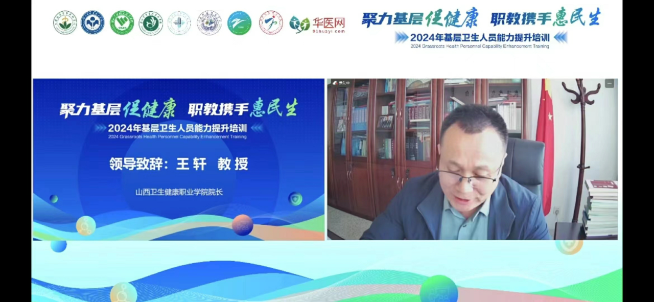 学院党委副书记、院长王轩代表承办单位致辞。他简要介绍了学院的办学历史、办学情况。他指出,为缓解广大基层卫生人员的工学矛盾,本次培训从全国8所兄弟院校遴选了24名职称副教授以上的优秀教师,采用“直播+录播”的方式,围绕适合基层医生的知识和技能开展。培训除理论知识外,增加了技能操作类视频,争取使基层卫生人员 “一看就会,一用就灵”。