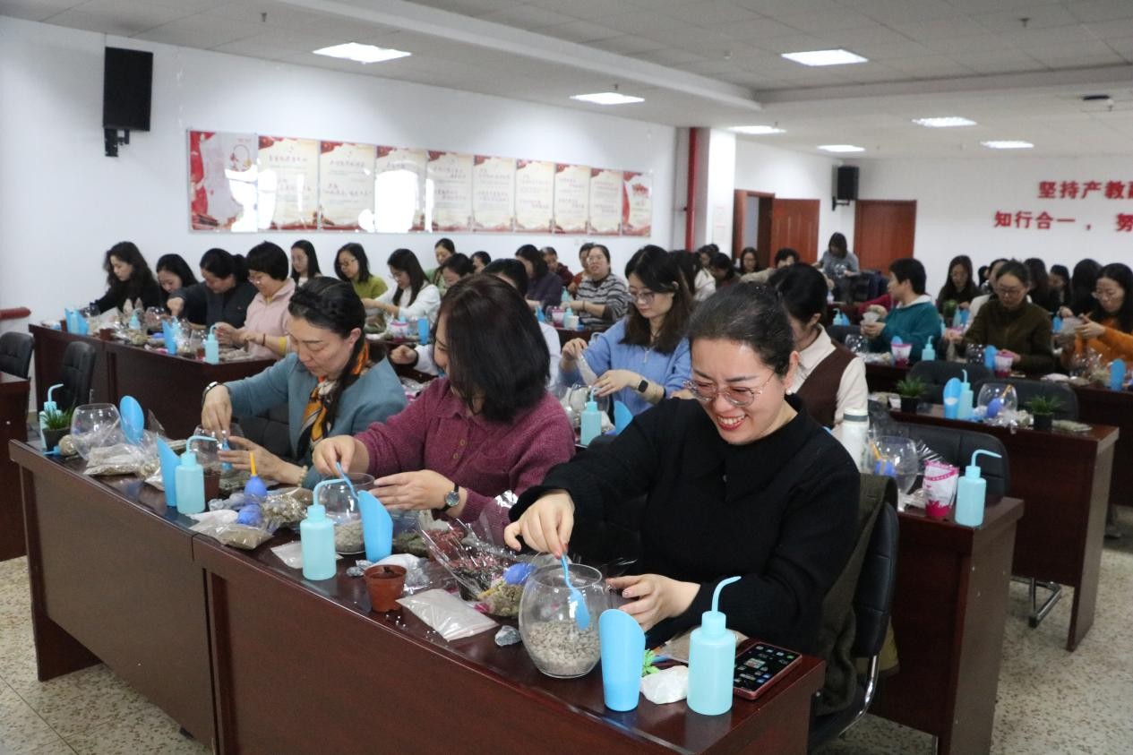 在专业花艺师的指导下,女教职工们围绕微景观设计理念、植物养护及构图技巧展开学习与实践。从苔藓多肉搭配到砂石摆件点缀,从色彩融合到层次布局,大家认真聆听讲解、互动探讨细节,现场气氛轻松热烈。老师们或俯身培土,或凝神设计,方寸容器间绿意渐显,一盆盆清新雅致的作品陆续诞生,展现出女性特有的细腻审美与创新活力。