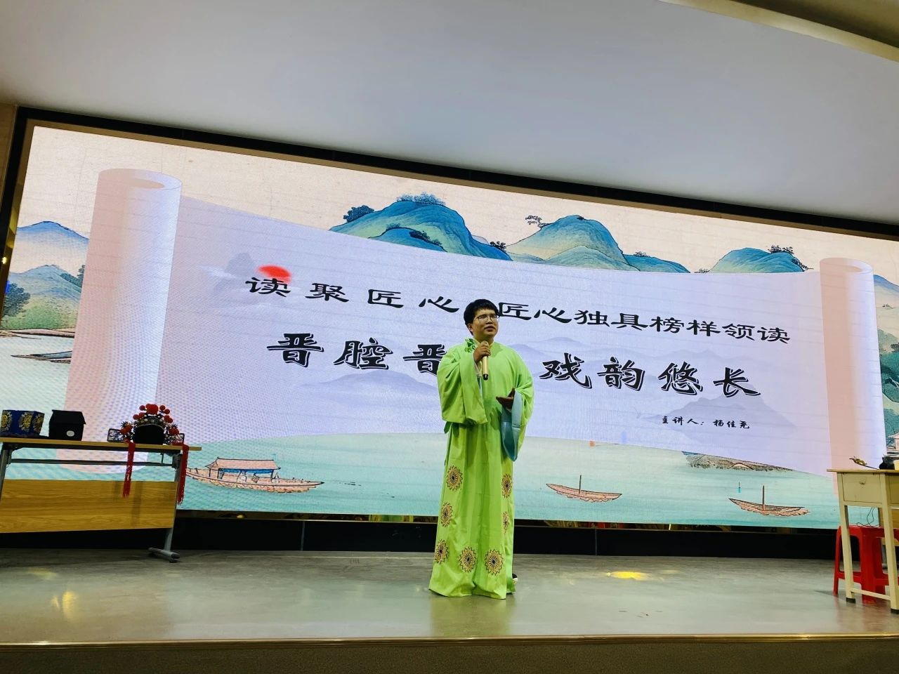 杨佳尧生长在戏曲底蕴深厚的长治,自幼受戏曲文化熏陶,长期关注戏曲研究、推广与传承。他以“晋腔晋韵 戏韵悠长”为主题,从山西戏曲、戏曲表演形式及音乐、戏曲行头、传承与发展四个维度,对山西戏曲角色、表演形式、音乐等方面进行细致地讲解。他通过丰富多彩的服装、盔头展示以及现场演绎,让在场师生直观感受到戏曲服饰文化以及高亢激昂、婉转细腻的唱腔。并建议对戏曲有兴趣的师生可以阅读《山西戏曲概说》《中国艺术》《华服霓裳》三种书籍,继续丰富戏曲相关知识。
