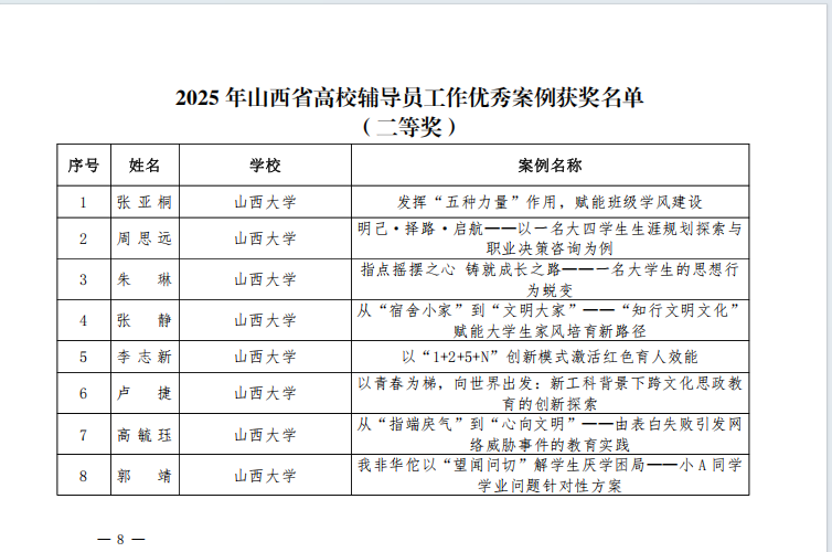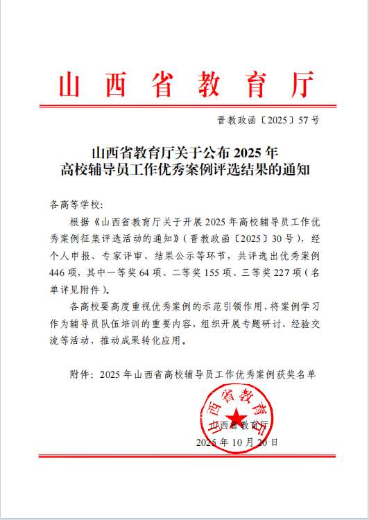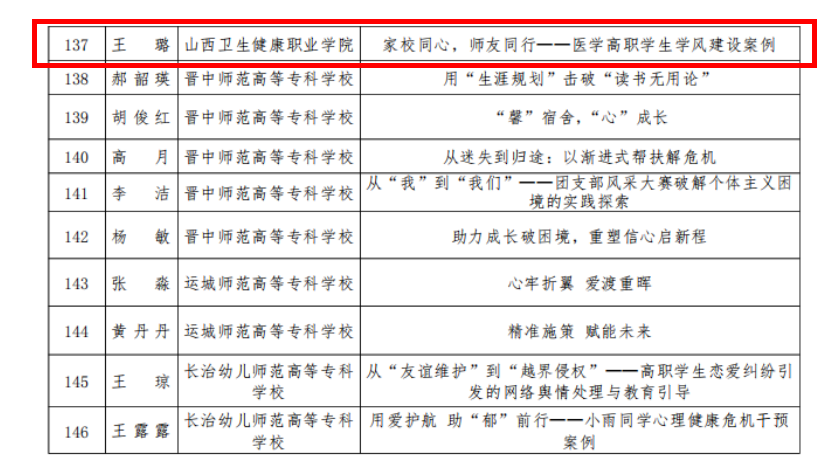 近日,山西省教育厅公布2025年高校辅导员工作优秀案例评选结果,我院辅导员王璐撰写的《家校同心,师友同行 —— 医学高职学生学风建设案例》,荣获二等奖。