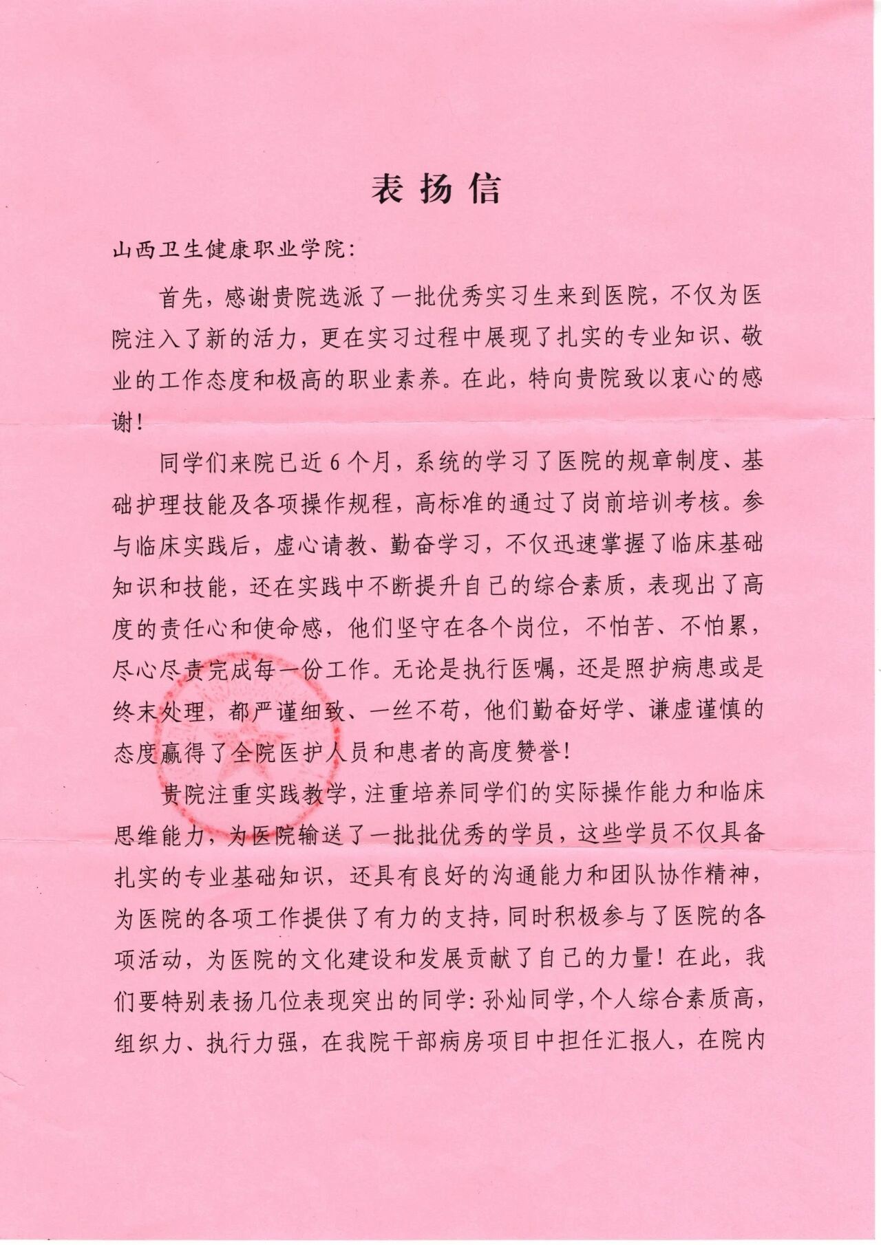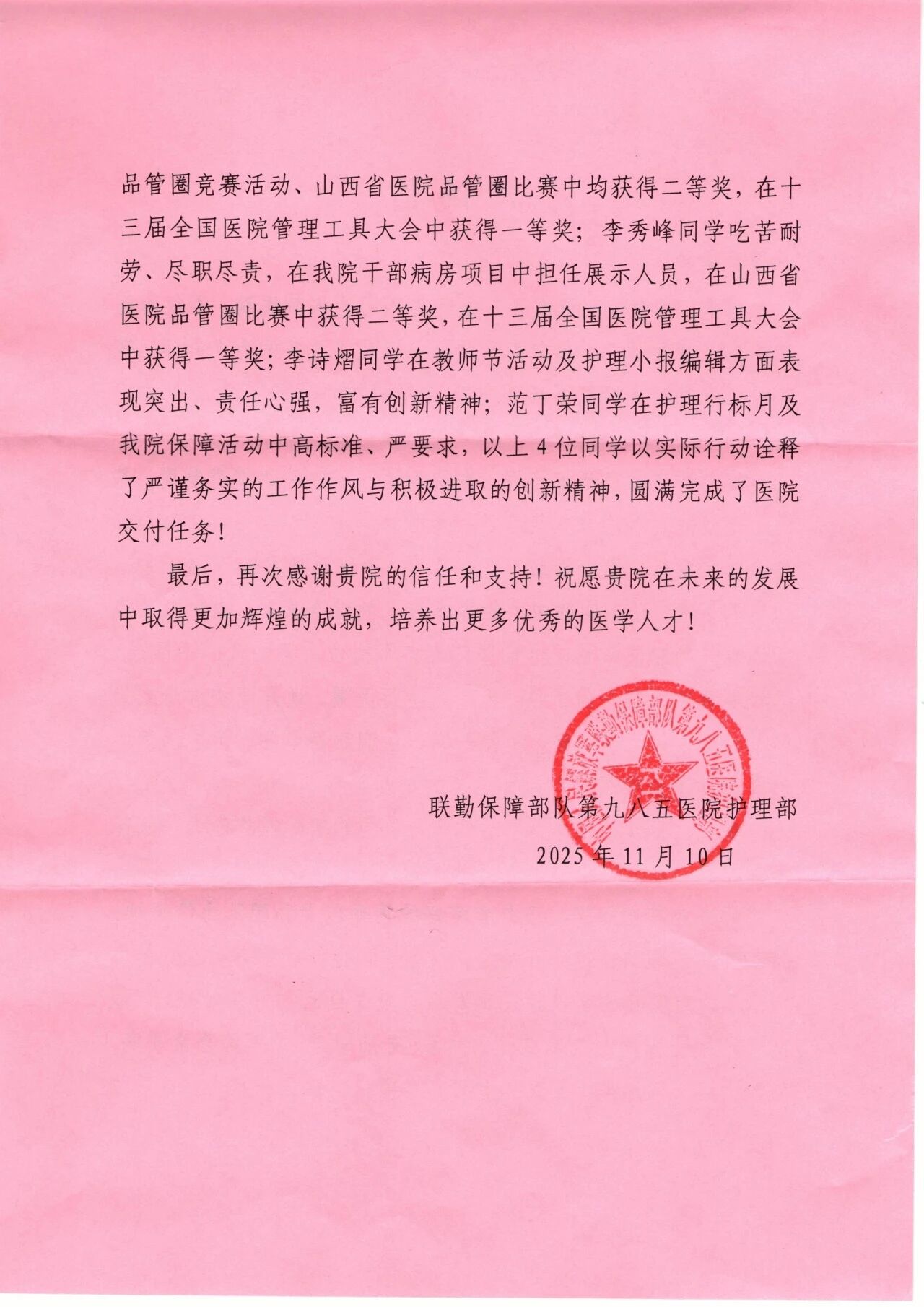来信重点表扬了孙灿、李秀峰、李诗熠、范丁荣4名实习学生在医院工作及赛事活动中的突出贡献,以实际行动展现了我院学子“严谨务实、积极进取”的风貌。孙灿、李秀峰同学在第十三届全国医院管理工具大会、山西省医院品管圈比赛中均斩获一、二等奖;李诗熠在教师节活动、护理小报编排中展现创新精神;范丁荣在护理行标月、医院保障活动中以高标准完成任务。