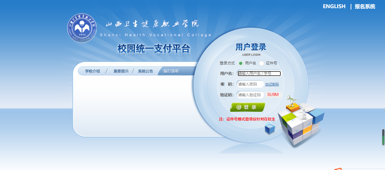 ① 打开链接/index.html(统一支付平台网址),输入用户名(默认为学号),密码(Sxhvc@身份证后6位)、验证码登录。