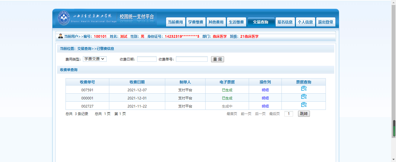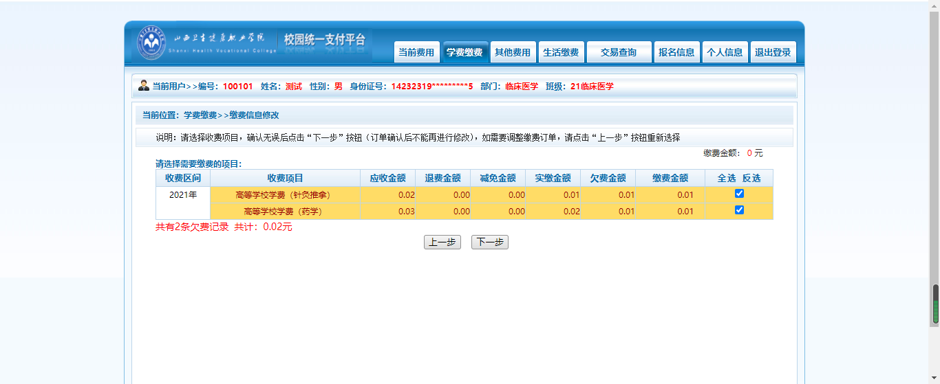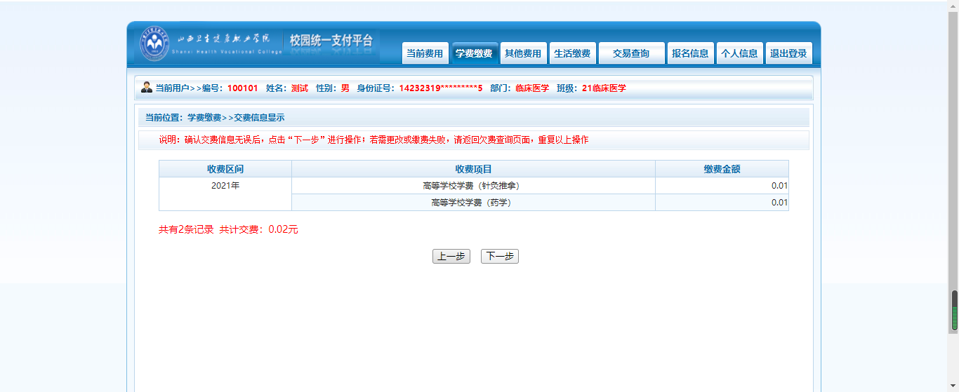点击【学生缴费】->【下一步】,开始缴费