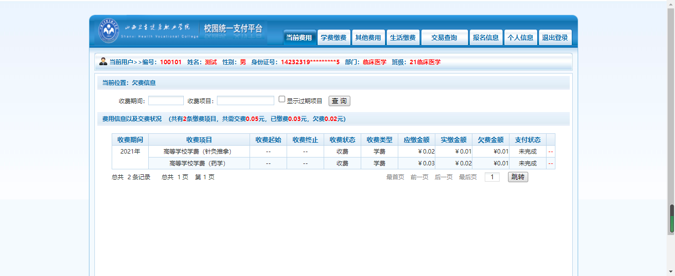 【当前欠费】显示了当前学生的欠费信息