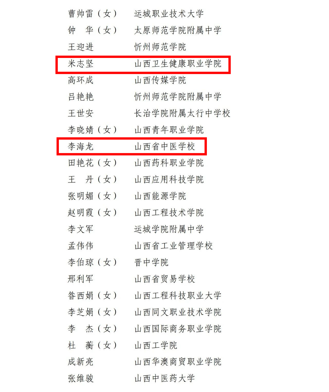 近日,山西省教育厅公布了《山西省人力资源和社会保障厅、山西省教育厅关于表彰山西省教育系统先进集体、模范教师和先进工作者的通知》,经组织评委会评审,授予山西省实验小学等65个集体、张慧等609名教师、雷晟等61名教育工作者分别为山西省教育系统先进集体、模范教师和先进工作者表彰对象。其中,我院(校)教师米志坚、李海龙被评为山西省教育系统模范教师。