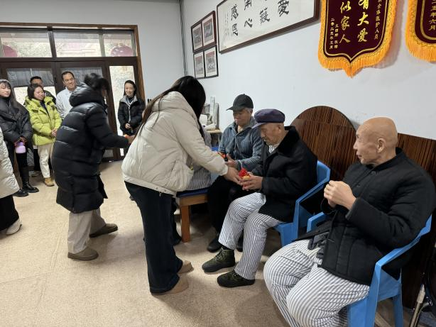 随后,队员们走访看望院内的“五独老人”——他们无子女、无配偶、无亲属、无朋友、无社会支持,生活照料与精神慰藉需求尤为迫切。同学们俯身倾听,与老人促膝长谈,耐心询问身体状况与生活起居,并以“橙”意满满的爱心水果传递“诚心如意”的美好祝愿。一声声问候、一次次搀扶、一段段家常,化作冬日里最温暖的陪伴。