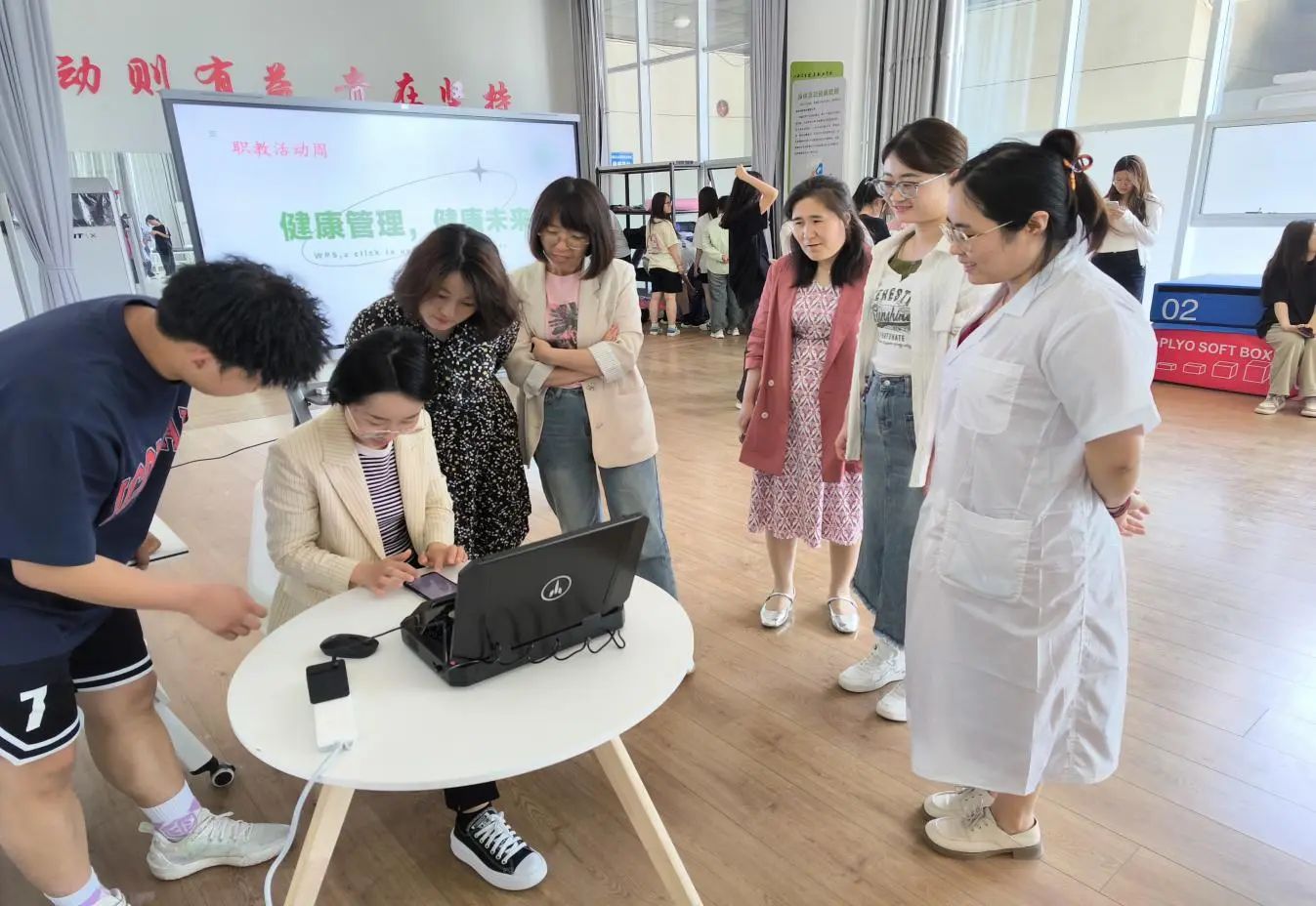 活动中,利用“全民健康普查检测仪”对师生进行健康普查,健康管理专业师生同步对健康普查结果进行一对一解读,并提供健康指导。健康管理专业的同学还为参加活动的师生进行了腰围、臀围、皮脂厚度测量,运动指导和运动设备体验。现场气氛活跃,参与度高,完美契合了“一技在手,一生无忧”的职业教育活动周主题,展示了学院健康管理专业的教育教学成果。