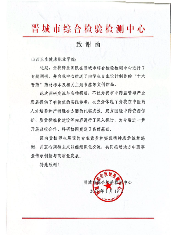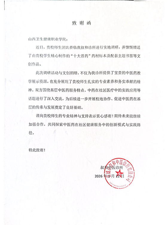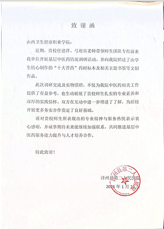 近日,泽州县第一医院、晋城市综合检验检测中心、叔和中医诊所等合作单位纷纷发来致谢函,高度肯定我院师生在寒假中医药专题社会实践中展现的专业素养、务实精神、热忱服务,称赞此次实践为基层中医药发展提供了有益参考,为后续校地在人才培养、科研协同、基层服务等方面的合作奠定坚实基础。